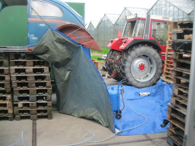 De eerste klus is nu het dak en kraalranden stralen en spuiten.